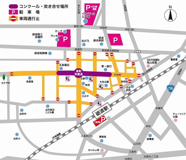 となみ夜高まつり交通規制略図 ← click(駐車場の記載もあります)