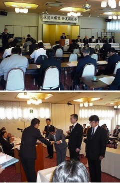 | 令和元年6月7日、和風会館ふかまつに於いて平成30年度定期総会を、来賓に齊藤副市長、北村商工会議所会頭らをお迎えし、開催致しました。 平成30年度事業報告・収支決算、令和元年度事業計画・収支予算案が承認されました。 同日開催された従業員表彰では、永年に渡り地域産業の発展に尽力された永年勤続者12名、職務に精励し他の模範となる優良従業員4名の方が受賞されました。おめでとうございました。更なるご活躍をご祈念申し上げます。 表彰を受けられた方々は こちら をご覧下さい。(PDF) |
