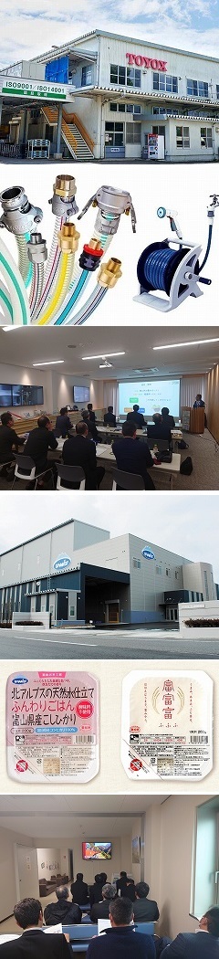 | 庄川町事業所協会と合同で2025年3月19日、優良事業所視察事業として、黒部市のトヨックス、入善町のウーケ富山を訪問しました。 「㈱トヨックス」 黒部市前沢に立地する㈱トヨックスは、1963年に東洋化成として創業、1983年に現在の社名に変更されておられ、プロパンガスホース開発製造を皮切りに、工場機器設備ホース、建築・建設用の作業ホースや家庭の水まわりホース、園芸用の散水ホースなど、幅広い分野で使用されるホース及び接手金具の製造メーカーです。 ホースを通じて流すものは、水はもちろん空気、油、粉、薬があり、これらを運ぶ「流体輸送システム」を提供しており、特に「耐圧ホース」分野では国内シェア70%を占めておられます。技術開発には注力しておられ、3300件を超える特許出願、ホース業界では困難といわれた、FA無人化にも取り組んでおられます。 お客様への安定した納品を実現するため、また自然災害に備えて、工場の分散化、防災強化、安心在庫、在庫拠点の分散化など、BCP(事業継続計画にも積極的に取り組んでおられます。 省エネや低環境負荷型の商品開発、石油系原料から天然資源由来原料へのシフト、、廃棄物の削減、伏流水の活用、クリーンな排水、太陽光発電の導入、里山保存活動等をSDGsへも貢献されています。 企業が取り組む事業テーマとして「地球環境の保護と創造をめざす」を掲げておられ、まさにそのテーマ実現のために活動されている企業であると感じました。 「㈱ウーケ」 「お米本来の風味と栄養を活かしたご版の製造・販売を通じ、健やかで明るく豊かな食生活の実現、及び、日本の米文化の発展と食料自給率の向上に貢献します」の企業理念のもと、環境省認定の名水百選に選ばれた「黒部川扇状地湧水群」のある入善町に、㈱ウーケは2007年に設立されました。 黒部川伏流水の良質な軟水の使用、品質の高いお米をトレイの中で炊き上げる製法で製造される無菌包装米飯は、2010年には国際味覚審査機構(ベルギー・ブリュッセル)主催の優秀味覚賞で二つ星を受賞、世界食品安全イニシアチブで評価された認証スキームである品質安全国際規格SQF(Safe Quality Food)の認証も取得されており、世界でも評価されています。 近年のライフスタイルの変化により、一人暮らしや共働きの家庭では、レンジでチンで炊き立てのご飯が食べられるウーケ製造の「ふんわりごはん」が喜ばれているとのことでした。また災害地での非常食としても利用されています。会社設立後、需要が高まり、2013年、2019年と工場を増設されました。 ウーケのふんわりごはんは、①張込み②精選③浸漬④充填⑤殺菌⑥加水⑦炊飯⑧シール⑨蒸らし⑩検査⑪放送⑫出荷という12の工程を経て製造されています。 工場は、海洋深層水取水施設に近く、「冷たい海洋深層水」の冷熱を取り込み、製造エリアの冷却に利用されています。放熱後の温まった深層水は隣接する施設で「牡蠣」の浄化に二次利用されているそうです。これらにより年間1480トンのCO2の削減を実現しておられます。 |